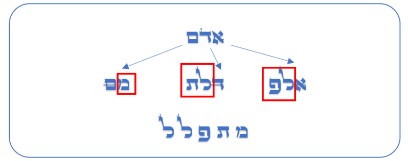אדם (adam) uitgespeld is alef אלפ , dalet דלת en mem מם , zoals te zien in het schema hieronder.